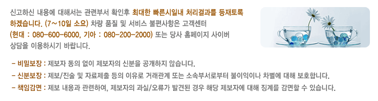 · 『투명구매신고센터』는 구매 직원의 금품/향응 요구나, 구매 임직원 및 협력사의 윤리실천강령 위반에 대한 제보, 신고, 고발을 받고 있습니다. · 상생지원프로그램 및 부품가/투자비 문의, 유동성 지원 요청, 제도/프로세스 건의, SQ미인증 사례, 기타 홈페이지 이용 문의는 『상생협력실천센터 협력사 소리함』 이용하시면 신속한 답변을 받으실 수 있습니다. |